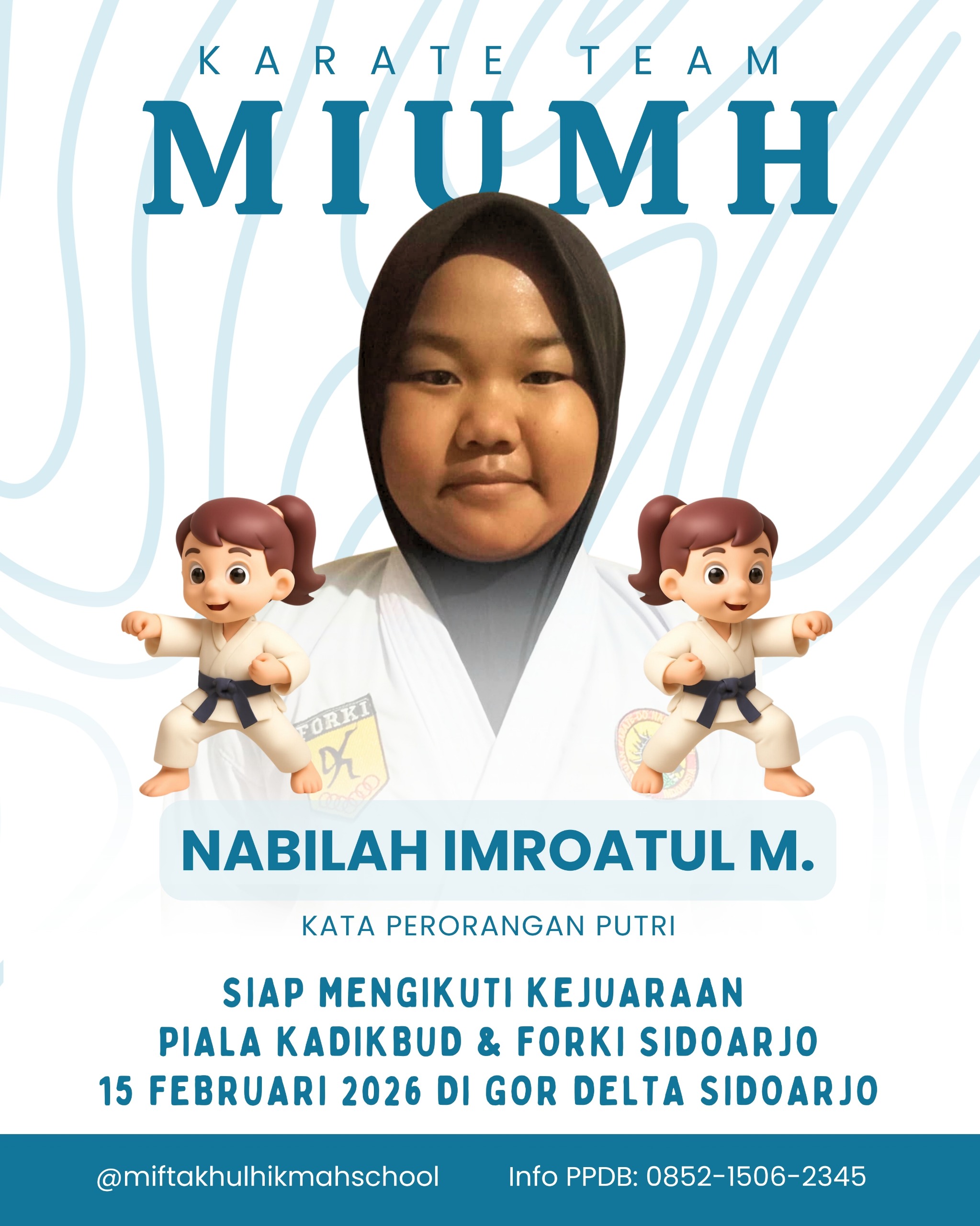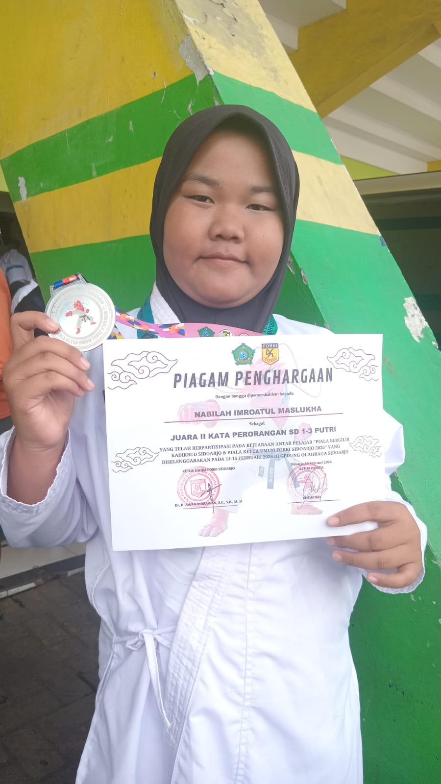 Sidoarjo, (15/02/2026) — Prestasi membanggakan kembali ditorehkan oleh siswa MI Unggulan Miftakhul Hikmah. Nabila Imroatu Maslukha berhasil meraih Juara II Kata Perorangan SD 1–3 Putri dalam ajang Kejuaraan Antar Pelajar “Piala Bergilir Kadikbud Sidoarjo & Piala Ketua Umum FORKI Sidoarjo 2026” yang diselenggarakan pada 14–15 Februari 2026 di Gedung Olahraga Sidoarjo.