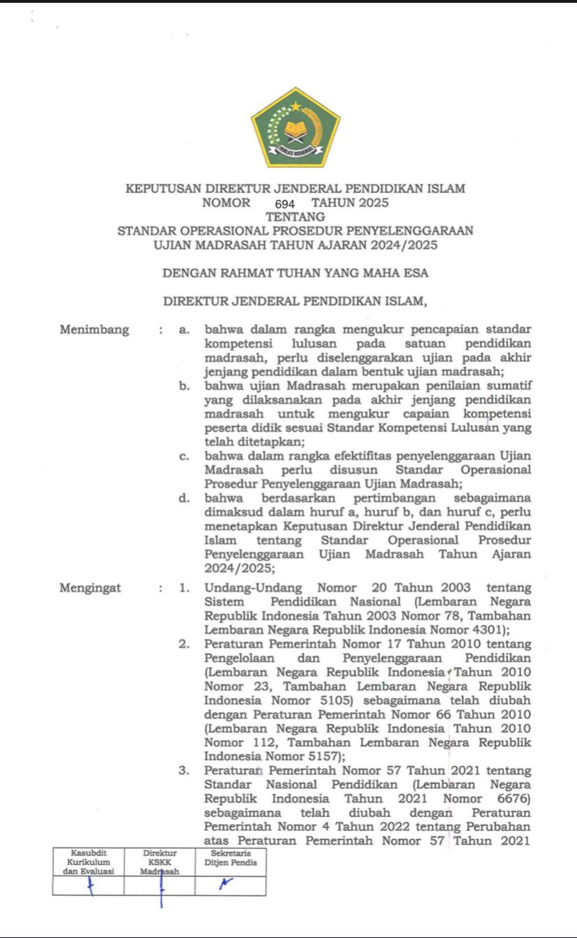 Mengacu pada Surat Direktorat Kementerian Jenderal Pendidikan Islam Kementerian Agama Republik Indonesia, Nomor: B-46/Dt.I/PP.00/02/2025 tentang Standar Operasional Prosedur Penyelenggaraan Ujian Madrasah Tahun Ajaran 2024-2025. sebagaimana diatur dalam KMA (Keputusan Menteri Agama) Nomor 450 Tahun 2024 tentang Pedoman Implementasi Kurikulum.